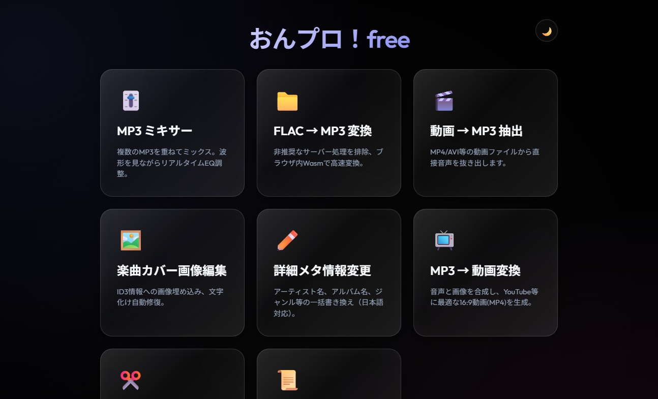 mp3総合編集ツール。広告なし無料。EQ+切り張り音源編集、完全日本語対応メタ情報修正、カバー用画像簡単制作、歌詞変換、動画化、動画から音声抽出